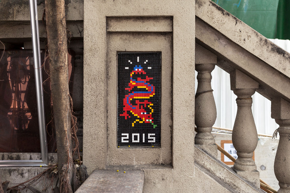 I have also added 24 new street pieces in the city an therefore reached a total of 99 Space Invaders installed in Hong Kong. Most of them can be seen in World Invasion. The lastest one, HK_99, has invaded the building of the local newspaper Apple Daily with a special media invasion of the newspaper of May 15.