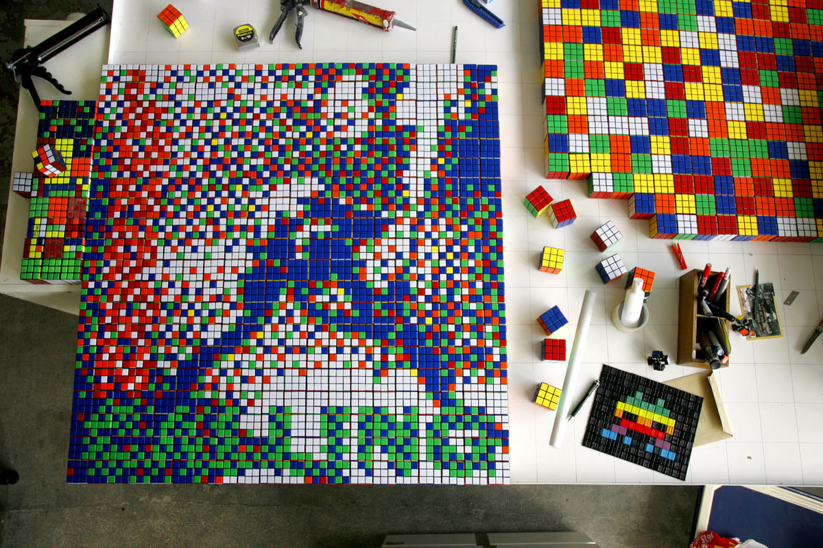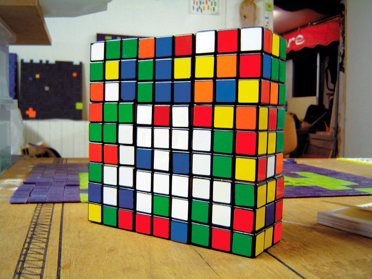 En 2005, Invader prolonge son travail sur le rapport entre pixel et mosaïque en créant, cette fois-ci avec des Rubik cubes, de véritables tableaux-objets.